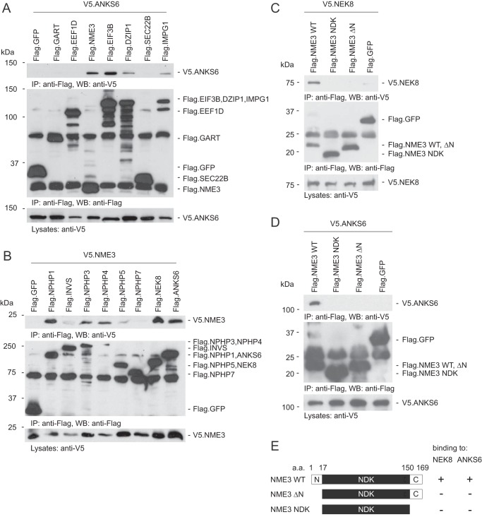 Figure 1. NME3 interacts with NPHP1, -3, -4, NEK8, and ANKS6, and the N-terminal 17 amino acids are necessary for its interaction with ANKS6 and NEK8.
