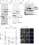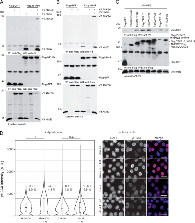 A, FLAG-tagged NPHP4 was coexpressed with V5-tagged ANKS6 and NME3. After immunoprecipitation with an anti-FLAG antibody, NPHP4 was detected in the precipitate in which NME3 was coexpressed (lane 6). B, FLAG-tagged NPHP1 was coexpressed with V5-tagged ANKS6 and NME3. After immunoprecipitation with an anti-FLAG antibody, NPHP1 was detected in the precipitate in which NME3 was coexpressed (lane 6). C, NME3 showed physical interaction with TMEM67, TTC21B, WDR19, CEP164, and IFT172. D, IMCD3 cells were immunostained for γH2AX, and mean intensity measurements were performed by high-content screening microscopy for at least 3000 cells per condition (violin plots) in three replicates. Percentages and standard deviations of cells above a mean intensity cutoff at 800 absorbance units (a.u.) indicated by a horizontal line are given (*, p = 0.014; n.s., not significant; t test). Representative images are shown on the right. Scale bars, 25 μm (D). IP, immunoprecipitation; WB, Western blotting; Tet, tetracycline; Luci, luciferase.