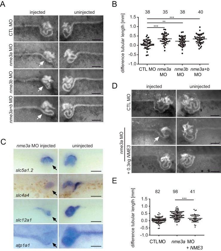 A, after unilateral injection of control (CTL) MO, nme3a MO, and/or nme3b MO, Xenopus embryos were stained with fluorescein-conjugated lectin to visualize the pronephric epithelia. The morphants showed a strong simplification of the proximal tubules on the nme3 MOâinjected side in contrast to the uninjected side (white arrows). Scale bars, 200 μm. B, differences in tubular length between the uninjected and injected sides were measured and calculated (**, p = 0.008; ***, p < 0.001; t test; error bars represent S.D.). C, after unilateral injection of nme3a MO, WISH for different pronephric segment markers was performed. The expression of all markers investigated was reduced on the nme3a MOâinjected side (black arrows). Scale bars, 50 μm. D, representative pictures of pronephric tubules stained by fluorescein-conjugated lectin. The simplification of the pronephric tubule observed upon nme3a depletion (white arrow) was partially rescued by coinjection of human NME3 RNA. Scale bars, 200 μm. E, quantification of the nme3a MO rescue experiment. Coinjection of NME3 mRNA reduced the difference in tubular length between the nme3a-depleted and the uninjected side in Xenopus embryos (***, p < 0.001; t test; error bars represent S.D.).