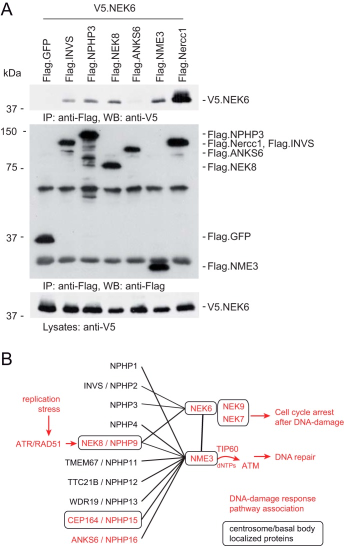 A, V5-tagged NEK6 was coexpressed with different FLAG-tagged proteins in HEK293T cells. After immunoprecipitation with an anti-FLAG antibody, NEK6 was detected in the precipitates of INVS, NPHP3, NME3, and NERCC1 (NEK9). B, schematic proteinâprotein interaction network. Basal body/centrosome-associated proteins are boxed, and proteins in red have been associated with the DNA-damage repair pathway. IP, immunoprecipitation; WB, Western blotting.