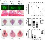 A, zebrafish embryos injected with control (CTL) MO, nme3 SB MO, or nme3 TB MO at 48 hpf. In contrast to the control embryos, nme3 morphants showed a curly-tail phenotype. Scale bars, 100 μm. Nme3-depleted zebrafish embryos showed pronephric cyst formation, visualized using the transgenic Tg(wt1b:EGFP) line (white asterisks). Scale bars, 50 μm. Histological sections of nme3 morphants stained by hematoxylin and eosin confirmed cyst formation (black asterisks). Scale bars, 10 μm. B, quantification of the percentage of cyst formation caused by knockdown and CRISPR-mediated mosaic indel formation of nme3 at 48 hpf (*, p < 0.05; ***, p < 0.001; t test; error bars represent S.D.). C, representative pictures of 18-somite-stage zebrafish embryos after WISH for spaw with normal, bilateral, or inverted spaw expression (black arrows). D, quantification of the percentage of altered spaw expression in nme3 zebrafish morphants. E, examples of zebrafish embryos with normal (left) and reversed (middle and right) heart looping, visualized by WISH for the heart-looping marker cmlc2 at 48 hpf. The red arrows point to the atria. F, quantification of the percentage of heart laterality defects caused by nme3 depletion in zebrafish embryos at 48 hpf.
