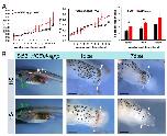 Fig. S3 AgRP inhibits limb regeneration in transgenic Xenopus, Related to Figure 2. (A) Body weight, length and food intake in HGEM-agrp transgenic and wild type (WT) young frogs, after heat shock induction of agrp. HGEM-agrp and wild type animals were heat treated daily in a 34ËC water bath, and their body weight, length (snout-vent), width (hip girth) were measured weekly. Food pellets were provided, and the number of pellets consumed was recorded daily. Error bars: standard derivation, N = 3 (B) Localized light beam heated activation of agrp in transgenic tadpole limb leads to regeneration defects. Transgenic animals have green lens (green arrows). White dotted lines demarcate the edges of regenerating limbs. Scale bars: 0.2 mm. Related to Fig. 2. |
