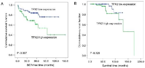 Figure 2. High TPX2 expression is associated with poor prognosis in patients with PCa. (A) Kaplan-Meier analysis of the BCR time of patients with PCa with high TPX2 expression levels was shorter compared with those with low TPX2 expression levels (P=0.007). (B) The overall survival time of patients with PCa was not associated with TPX2 expression levels (P=0.120). TPX2, Targeting protein for Xenopus kinesin-like protein 2; PCa, prostate cancer; BCR, biochemical recurrence-free time.