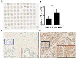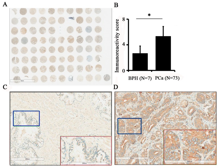 Figure 1. Immunohistochemical staining for TPX2 protein expression in PCa and adjacent benign tissues. (A) The whole scanned image of the tissue array (B) Statistical analyses indicated an increased immunoreactivity score in cancer tissues compared with benign tissues. (C) Enlarged image of BPH tissue indicated that TPX2 was only weakly expressed in benign tissues. Red box demonstrates the blue box at a magnification. (D) Enlarged image of PCa tissue demonstrated that TPX2 was highly abundant in the nucleus and cytoplasm of tumor cells. Red box demonstrates the blue box at a magnification. TPX2, Targeting protein for Xenopus kinesin-like protein 2; PCa, prostate cancer; BPH, benign prostatic hypertrophy. *P<0.05.