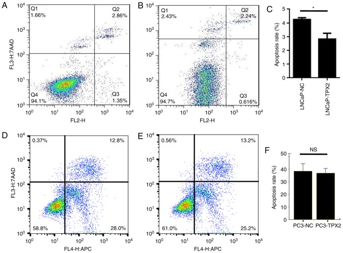 Figure 4. Overexpression of TPX2 inhibits apoptosis in LNCaP and PC3 cells. Cells overexpressing TPX2 were stained using Annexin V, and it was demonstrated that TPX2 decreased the rate of apoptosis in (A) LNCaP-NC and (B) LNCaP-TPX2 cells. (C) The apoptotic rate in the LNCaP-TPX2 group was 2.83±0.42, while it was 4.25±0.13 in the LNCaP-NC group (P=0.005). No difference in the apoptotic rate was observed between (D) PC3-NC and (E) PC3-TPX2 cells treated with docetaxel. (F) The apoptosis rates in the PC3-TPX2 and PC3-NC groups were similar (36.92±1.49 vs. 38.49±2.36; P=0.383). TPX2, Targeting protein for Xenopus kinesin-like protein 2; PCa, prostate cancer; NC, negative control; NS, not significant. *P<0.05.