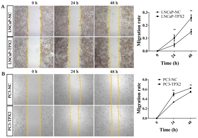 Figure 6. Overexpression of TPX2 enhanced wound healing of LNCaP and PC3 cells. Wound healing assay analysis was performed at 0, 24 and 48 h with or without TPX2 overexpression. The migratory ability was increased in (A) LNCaP-TPX2 and (B) PC3-TPX2 cells at 24 and 48 h. TPX2, Targeting protein for Xenopus kinesin-like protein 2; NC, negative control. **P<0.01.