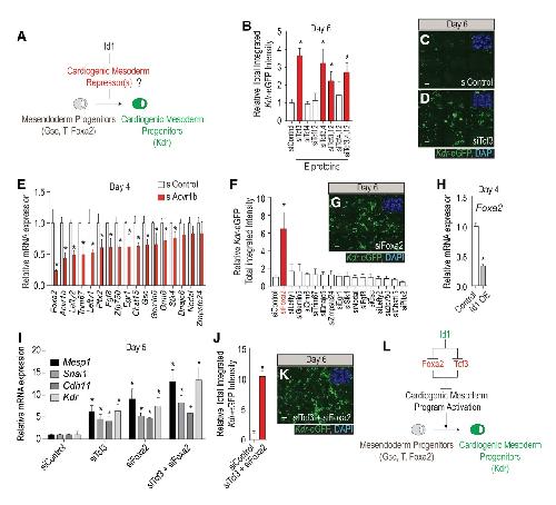 siFoxa2 condition. Bar, 50 μm. (L) Model showing Id1’s repressive role on Tcf3 and Foxa2 activity to promote cardiogenic mesoderm