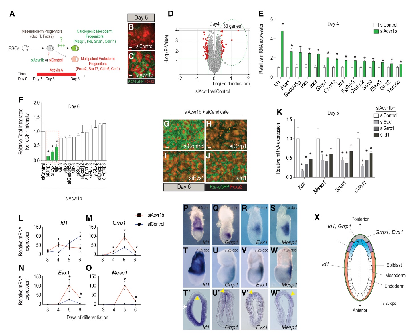 and Methods for details). siGrrp1, siEvx1, and siId1 strongly repressed siAcvr1b-induced cardiogenic mesoderm. (G–J) Representative