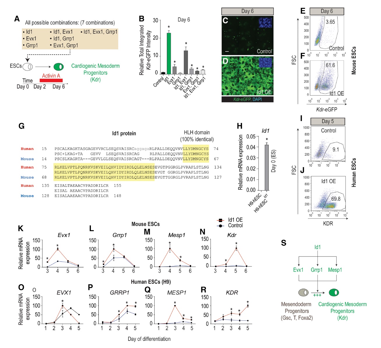 Figure 2. Id1 is sufficient to direct Kdr+ mesoderm formation in mESCs and hESCs. (A) Schematic of the strategy to evaluate the sufficiency