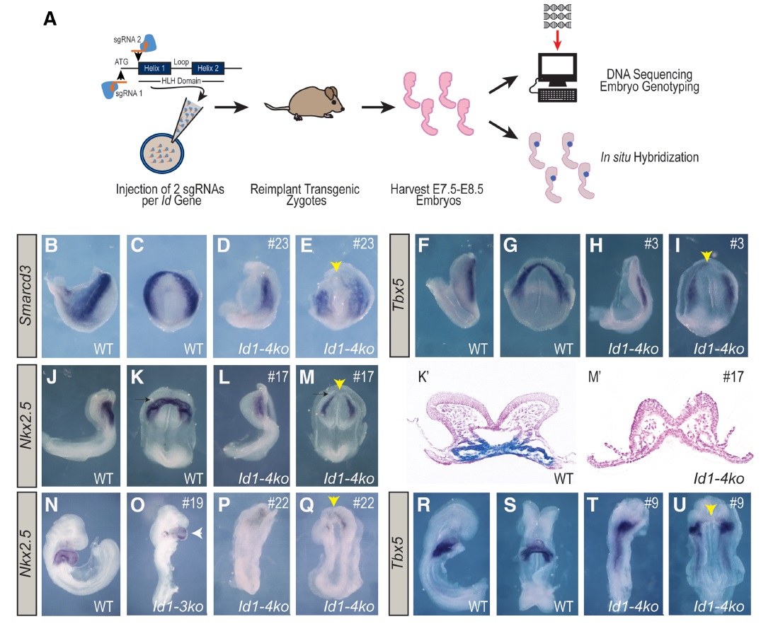 Figure 6. Id genes are essential for early heart formation. (A) Schematic illustrating the generation and analysis of Id1–4 mutant embryos