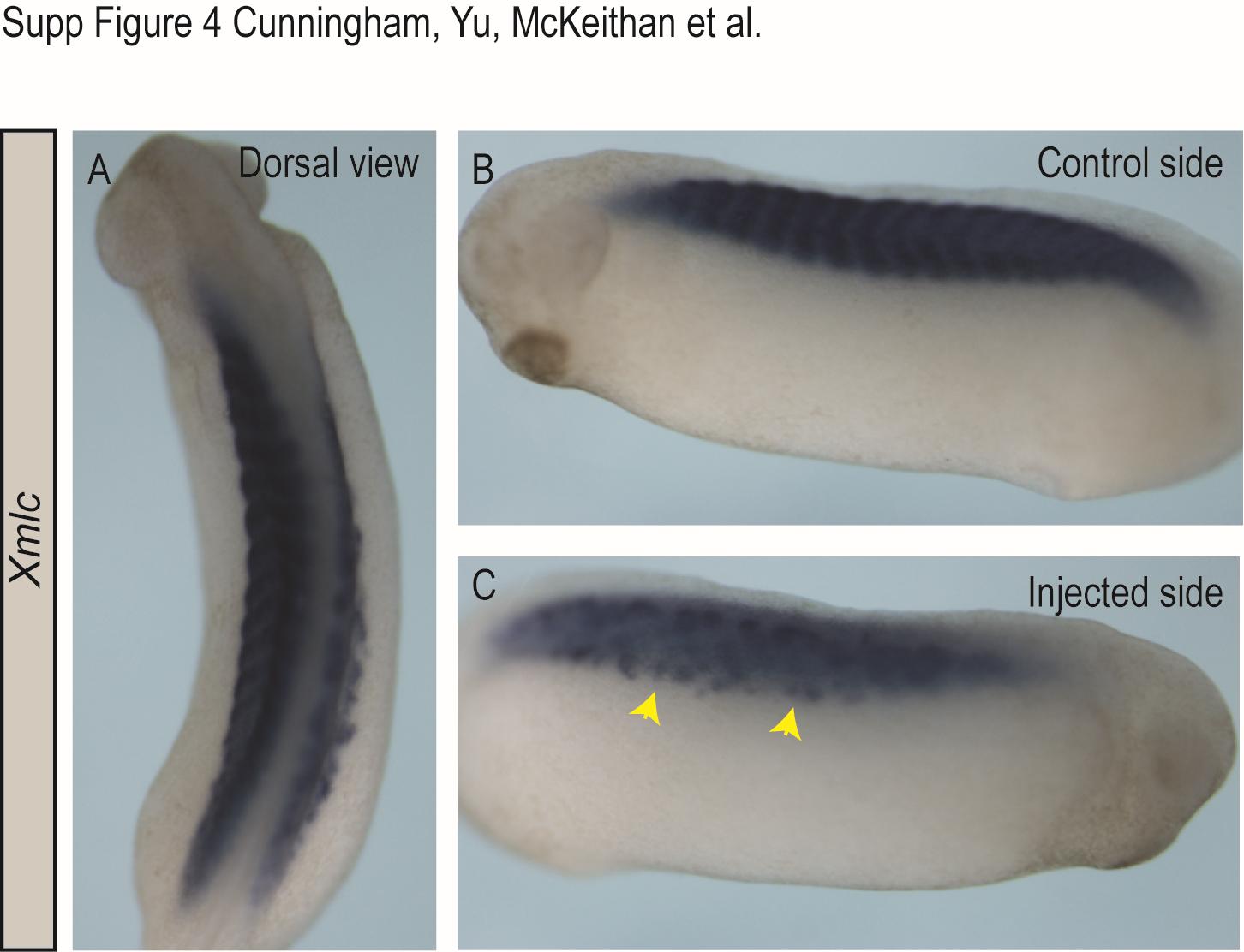 A-C) Embryos were hemilaterally injected at 4-cell stage as in Figure 5 and cultured to early tailbud stage (stage 25). Whole mount in situ hybridization probes for skeletal muscle marker Xmlc expression. Yellow arrows indicate decreased and disorganized pattern of expression in the injected side as compared to control side.