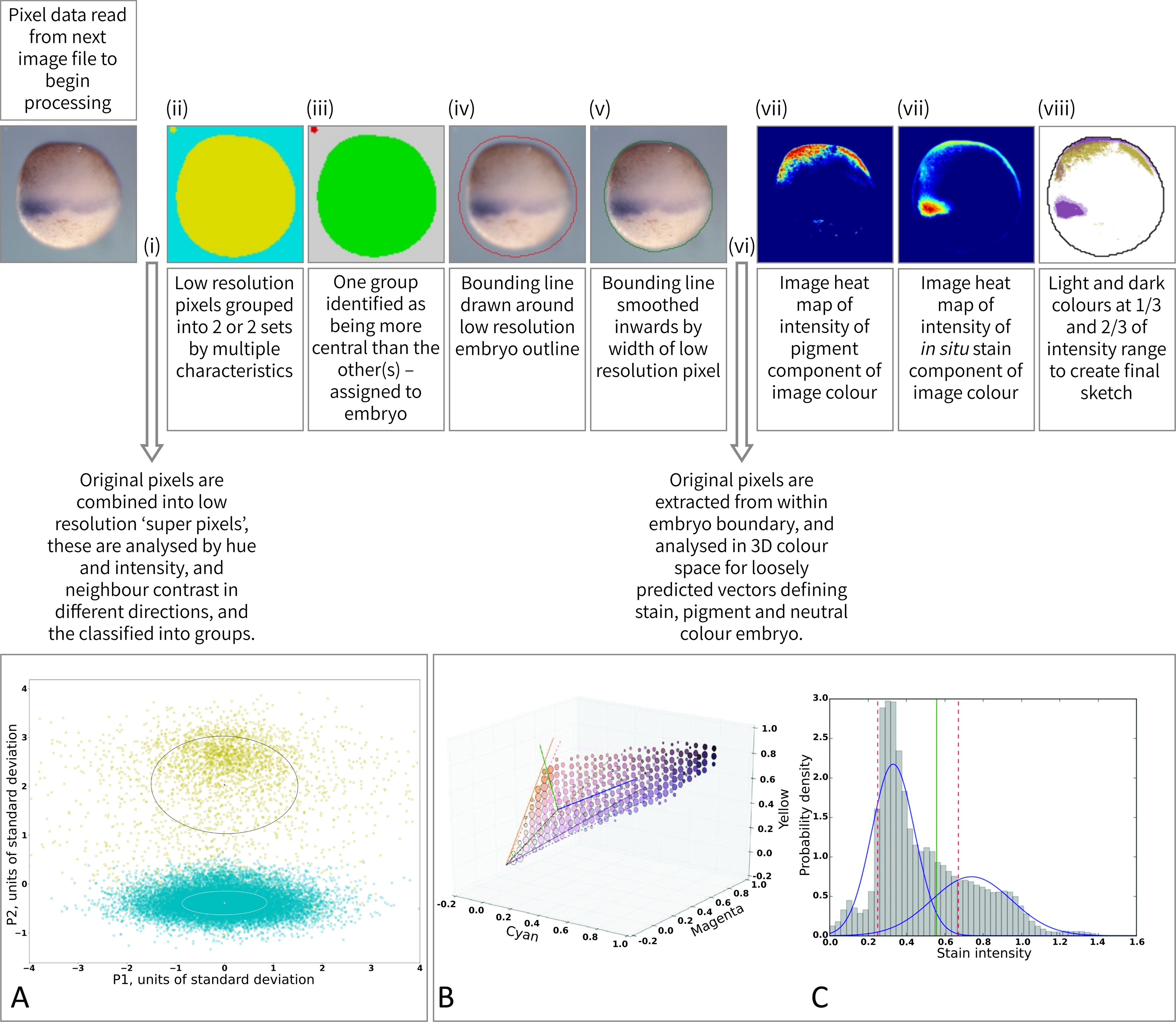 (Upper panel) schematic representations of the stages of image analysis. Text boxes contain brief descriptions, see text for more detail, roman numerals correspond to steps in the workflow. Arrows show where data is extracted from the image for analysis. (A) Orthogonal projection of whitened 18 dimensional data extracted from the image. Colouring is made on result of clustering, with crosses and ellipses represent centres and covariances of the identified clusters. (B) Example representation of pixel colour density in the 3D colour space, showing identification of vectors corresponding to in situ stain, pigmented and un-pigmented embryo, used to identify regions of the embryo expressing the gene in question. (C) Example histogram of stain distribution. Data modelled as mixture of two Gaussians. The threshold is the smallest of mu + 2*sigma of the two components; it is represented as a solid green line. Dashed red lines represent range of values [.25, .67] the threshold is allowed to take.