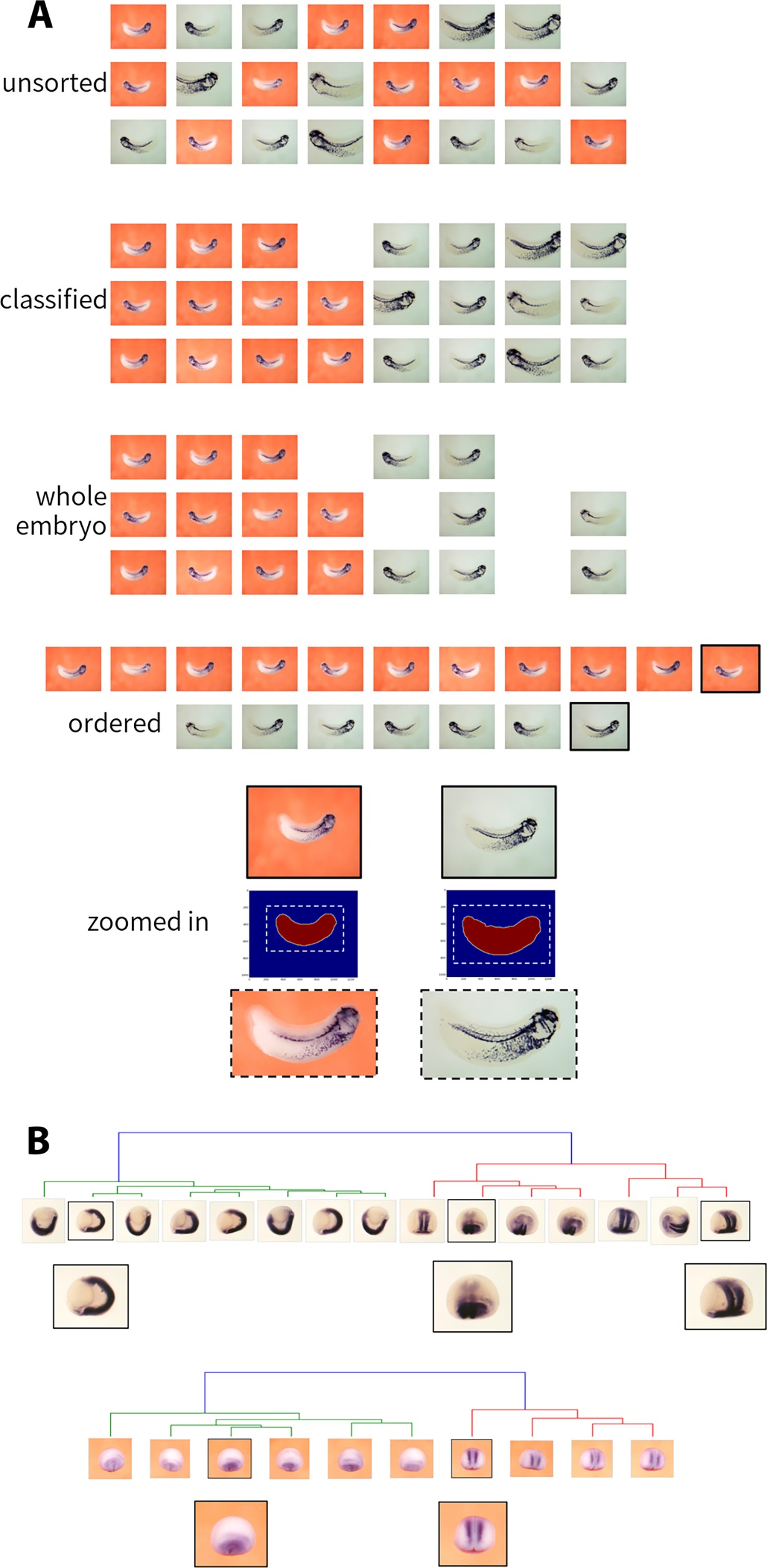 Unsorted images from a large collection for a given gene/development stage are first classified into cleared (grey background) and un-cleared (orange/red background) images. Embryo boundaries were detected within the image and embryo pixel colours analysed to yield predicted in situ stain, pigmentation or unmarked embryo. Embryos with predicted outline touching the image border were excluded (unless the outline in all images in the group touched the border). Images were sorted within groups by stain content for selection, and cropped for display where needed. (A) Lateral view images, NF stage 20+. (B) Quasi-spherical development stages (up to NF stage 20): images are clustered according to expression pattern similarity under rotational and other transformations (see also Fig 4), and the most stained image is selected from each well-separated group.