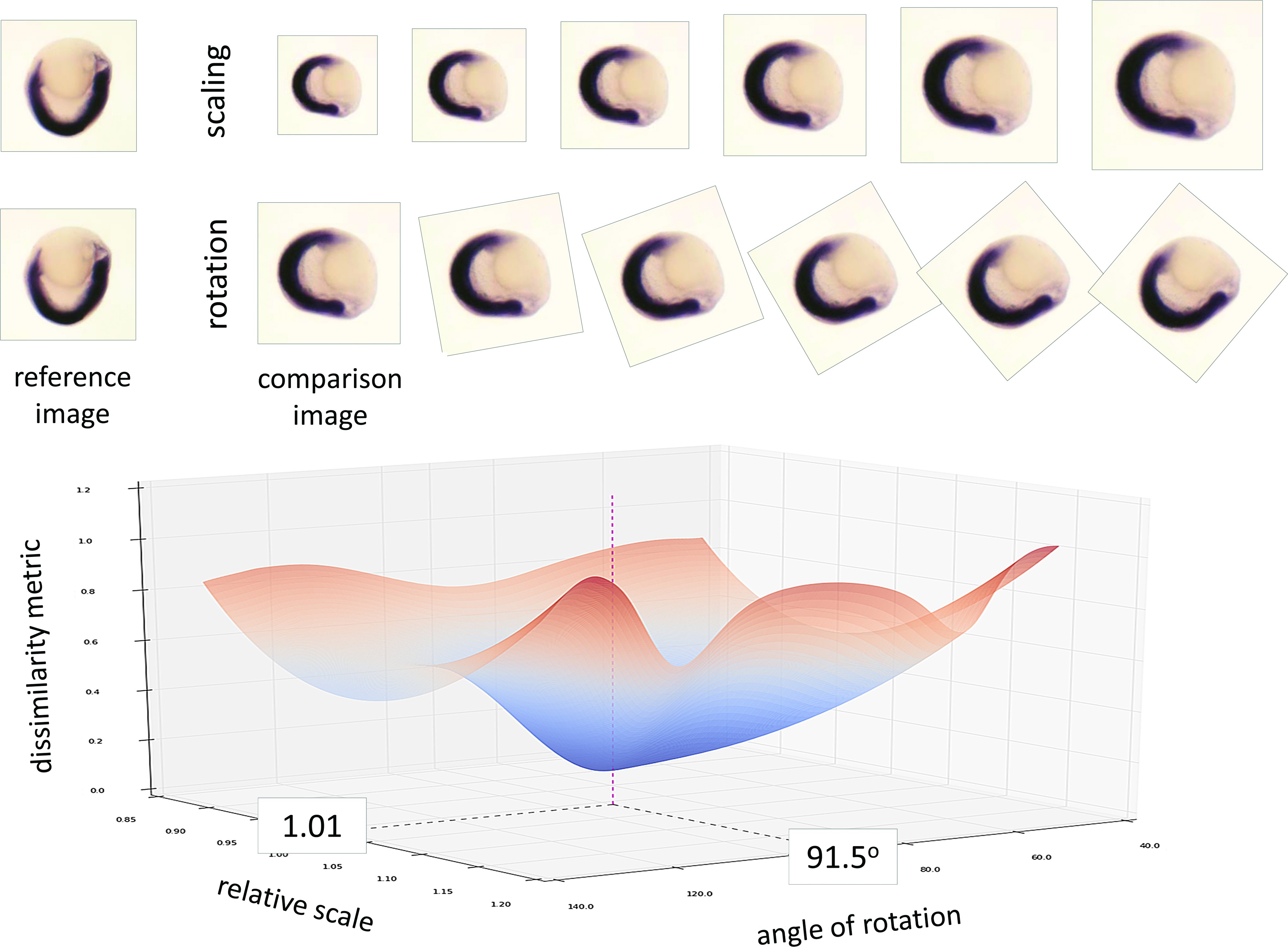 Early development stages are routinely photographed from different directions to maximise information about the expression pattern. Reference and comparison images for the same gene and stage are compared under multiple transformations (scale, rotation, shear) to identify the set of transformations that minimises their dissimilarity. Here we see that a 91.5o rotation and a 1.01 scaling suggest the most likely transformation between these two images. All images from the same gene and stage are compared with each other to identify images from (probably) the same view-point. See also Fig 3B.