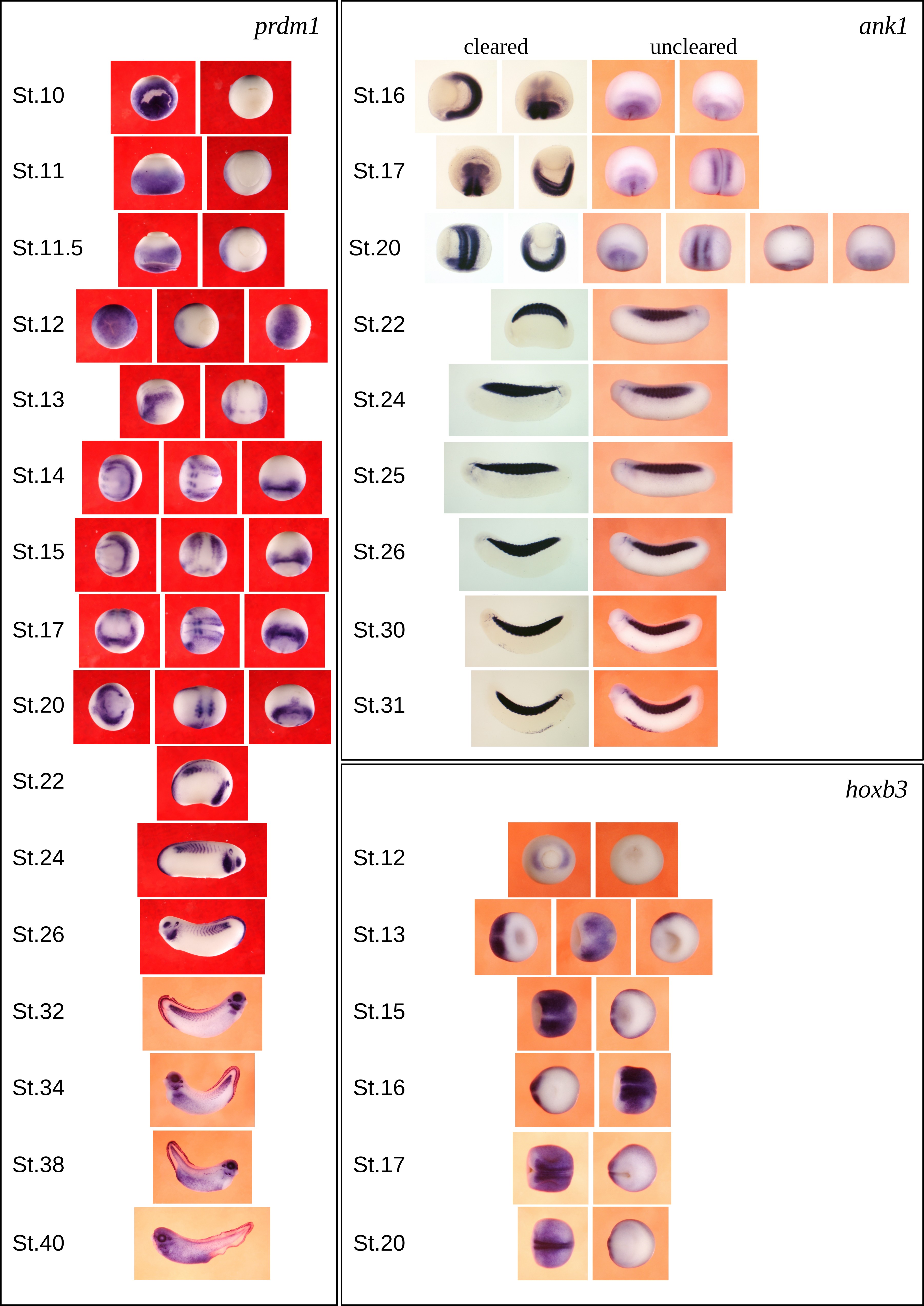 Fig 5. Developmental progression of expression for selected genes prdm1, ank1, and hoxb3 during Xenopus embryo development.
