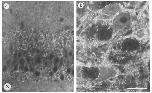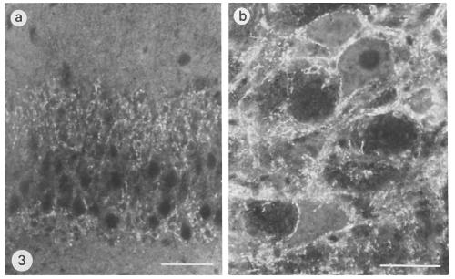 anti-rabbit IgGs (1:50). (a) CA3-CA4 region of hippocampus; (b) deep mesencephalic nucleus. Immunoreactivity is specifically localized
