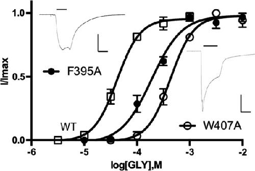 Fig. 2. Example concentration response curves and maximal current traces for WT and two mutant GlyR. Data = mean ± SEM, n = 4–8. Parameters obtained from these curves are shown in Table 1. Scale bars are 2 μA and 10 s