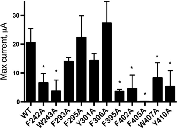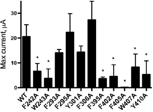 Fig. 3. Maximal currents elicited by glycine are lower in mutants with Ala substitutions to aromatics in M1 and M4. Data = mean ± SEM, n = 4–8, * = significantly different to WT, p < 0.05, ANOVA with Dunnetts post-comparison test