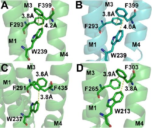 Fig. 6. GlyR in the open (A) and closed (B) states show similar interactions between W239, F293 and F399. Structural data show equivalent residue interactions are possible in the GABAA receptor (C) and GLIC (D)