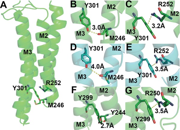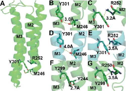 Fig. 8. Y301 in M3 (A) could form a hydrogen bond with M246 and/or a cationâÏ interaction with R252 in the open state (B, C) but probably not the former in the closed state (D, E). Similar interactions are possible in the GABAA receptor (F, G)
