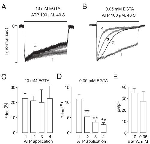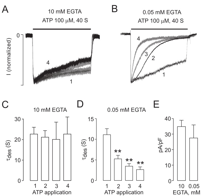 Figure 3. Use-dependent desensitization on PC12 cells. (A) Representative tracings of a single PC12 cell challenged with four successive applications of 100 μM ATP and the intracellular solution containing 10 mM EGTA; (B) The same experiment in other PC12 cells in which the intracellular solution includes 0.05 mM EGTA; UDD is developed under such conditions; (C,D) Summary of the desensitization constants in four consecutive ATP applications in cells clamped with an intracellular solution containing 10 mM (C) or 0.05 mM (D) EGTA; (E) Current densities for both conditions. ** p < 0.01, test. Mann-Whitney test. n = 4–8.