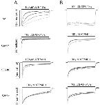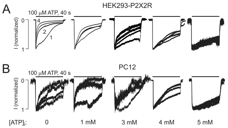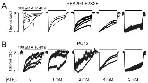 Figure 7. Intracellular ATP concentration-response experiments. (A,B) Traces of currents induced by repetitive application of 100 μM ATP for 40 s with 4 min washout periods for cells bathed in calcium-containing medium with the intracellular solution containing 0, 1, 3, 4 or 5 mM ATP in HEK293 cells transfected with the P2X2R cDNA (A) or in PC12 cells (B) that endogenously express the P2X2R. Recordings were performed in at least three different cells for each condition.