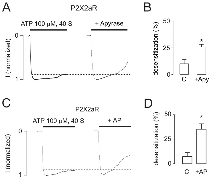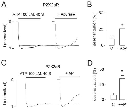Figure 8. Dependence of the rates of receptor desensitization on the status of intracellular ATP concentration and constitutive phosphorylation of channels. The experiments were performed in oocytes expressing P2X2aR. (A,C) Representative recordings from oocytes expressing P2X2aR either uninjected (left panels) or injected with 2.5 U/μL apyrase, an ATPase (A, right), or 1 U/μL alkaline phosphatase (AP), a hydrolase enzyme responsible for removing phosphate groups from many types of molecules (C, right). In both cases, the currents were generated by 100 μM ATP; (B,D) The mean ± SEM values of the percentage of desensitization after 40 s of ATP application in uninjected cells or those cells injected with apyrase (B, n = 8) or AP (D, n = 4); * p < 0.01 compared to control columns.