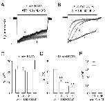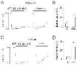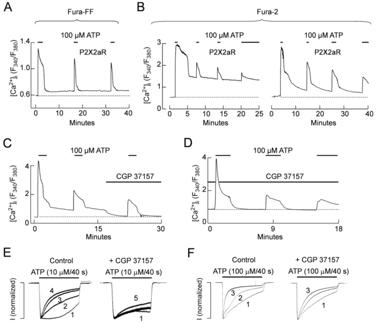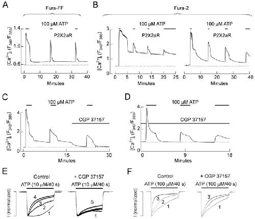 Figure 10. Repetitive ATP application increases basal [Ca2+]i. (A,B) Representative [Ca2+]i recordings from a P2X2aR-expressing GT1-7 cell in which 3 consecutive ATP application were done (horizontal black bars) with washout period of 15 min between pulses. Recordings were done using Fura-FF (A) or Fura-2 (B) as Ca2+-indicator; (C,D) Representative [Ca2+]i recordings from a P2X2aR-expressing GT1-7 cells in which 4 μM CGP 37157 was applied in the middle (C) or during the whole experiment (D). Horizontal black bars represent 100 μM ATP applications and dotted lines indicate the basal [Ca2+]i before to the first ATP application; (E,F) Representative recordings from P2X2aR-HEK293 cells in the absence (left) and in the presence (right) of 10 μM CGP 37157; currents were gated with 10 μM (E) or 100 μM (F) ATP.