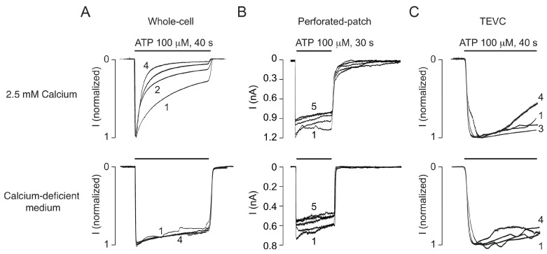 Figure 1. Dependence on recording conditions of the pattern of rat P2X2a receptor (P2X2aR) desensitization to repetitive ATP application. (A) Whole-cell recording in HEK293 cells. Traces of currents induced by repetitive application of 100 μM ATP for 40 s with 4 min washout periods for cells bathed in calcium-containing medium (2.5 mM; top traces) or in calcium-deficient medium (0.09 mM calcium; bottom traces) at a holding potential of −60 mV are shown. The progressive increase in the rates of receptor desensitization is termed use-dependent desensitization (UDD); (B) Perforated patch-clamp recording in HEK293 cells. Notice that there is no difference in the rate of receptor desensitization during repetitive agonist application (100 μM ATP for 30 s with 4 min washing periods) in cells bathed in calcium-containing (top) or calcium-deficient (bottom) medium; (C) Two-electrode voltage clamp (TEVC) recording in Xenopus oocytes. The currents induced by four consecutive ATP applications in oocytes bathed in calcium-containing (top) or calcium-deficient (bottom) medium are shown. In (A,C), the data shown are normalized representative recordings. In all panels, traces shown are representative of at least five similar experiments. In this and the following figures, horizontal black bars indicate duration of ATP application, and the numbers indicate the order of each ATP application.
