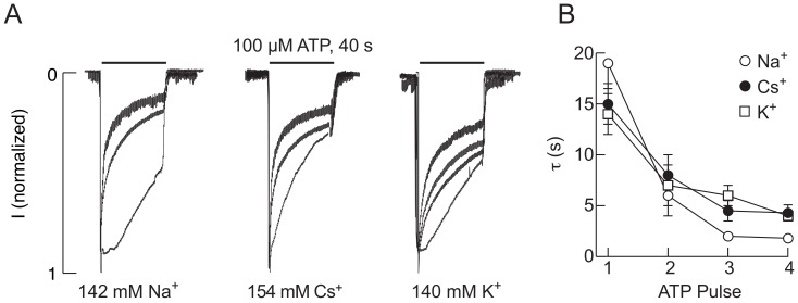 Figure 2. UDD is present and comparable in various intracellular ionic environments. (A) The traces shown are representative of whole-cell recordings in HEK293 cells with the intrapipette medium containing sodium (left), cesium (middle), and potassium (right) chloride. In all cases, 2.5 mM calcium was present in the extracellular medium, and the holding potential was −60 mV; (B) Mean ± SEM values of the rate of receptor desensitization (τ) derived from a monoexponential fit for sodium, cesium, and potassium-based intracellular solutions (n = 10–14 per group).