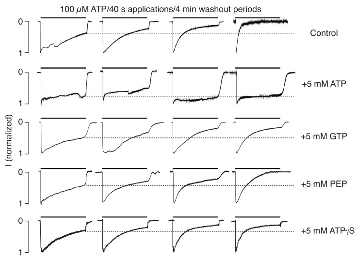 Figure 4. Intracellular ATP, but not GTP, phosphoenolpyruvate (PEP), or ATPγS, blocks receptor desensitization in the whole-cell recordings performed in HEK293 cells expressing P2X2aR. The cells were dialyzed with ATP, GTP, PEP, or ATPγS for 7 min before the start of the extracellular ATP application, and the holding potential was −60 mV. The horizontal dotted lines illustrate the peak in the current response at the end of the first ATP application. Notice that UDD is preserved in all cases except for the cells filled with 5 mM ATP.