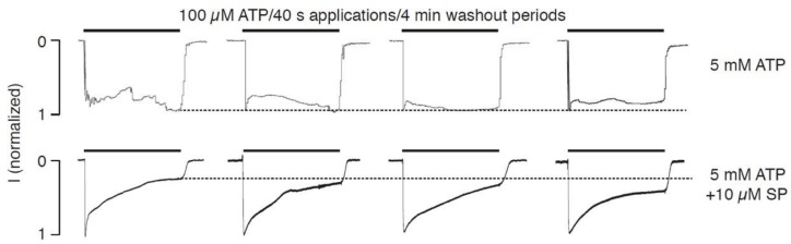 Figure 5. Potential role of protein kinases in the intracellular ATP effects on receptor desensitization; whole-cell recordings in HEK293 cells expressing P2X2aR at a holding potential of −60 mV. (Top panels) The loss of receptor desensitization in cells filled with 5 mM ATP-containing medium; (Bottom panels) Restoration of receptor desensitization in cells filled with a medium containing 5 mM ATP plus 10 μM staurosporine (SP). Notice the lack of UDD in the presence of SP. In both experiments, the cells were dialyzed for 7 min before the extracellular ATP was applied. The horizontal dotted lines indicate the peak amplitude of the current at the end of the first pulse of extracellular ATP.