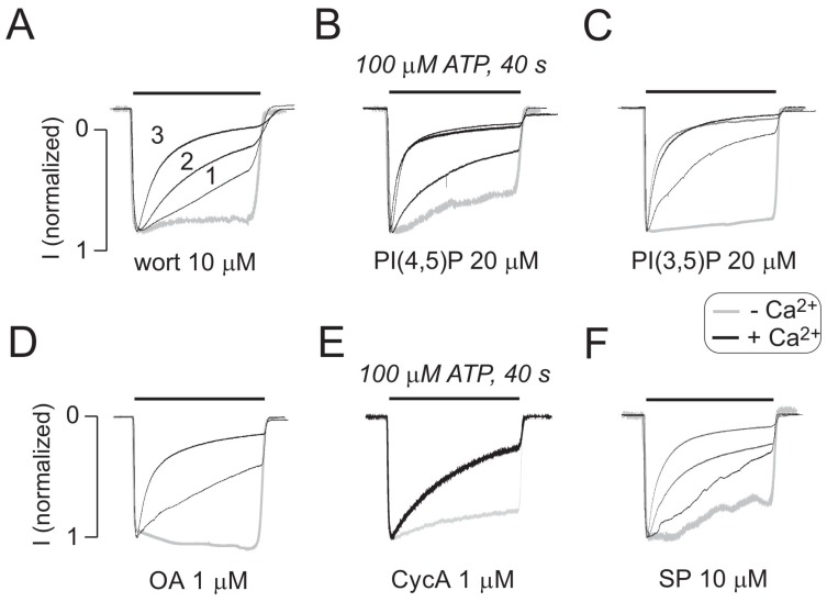 Figure 6. Independence of UDD of the status of kinases, phosphatases, and phosphoinositides in the absence of intracellular ATP. The results show whole-cell recordings from P2X2aR-expressing HEK293 cells clamped at â60 mV and containing kinase and phosphatase inhibitors or activators in the absence (gray traces) or in the presence (black traces) of 2 mM extracellular calcium. (AâF) The lack of effects of wortmannin (WT), an inhibitor of PI3 and PI4 kinases (A), the phosphoinositides PI(4,5)P2 (B) and PI(3,5)P2 (C), the phosphatase PP2B inhibitor okadaic acid (OA) (D), the calcineurin inhibitor cyclosporin A (CycA) (E) and staurosporine (SP), a nonselective kinase inhibitor at the concentration used (F), on the development of UDD during repetitive agonist application. The cells were dialyzed for 7 min before the start of the experiment, and the washout periods between ATP applications were 4 min each. The recordings shown are representative of at least 3 different experiments.