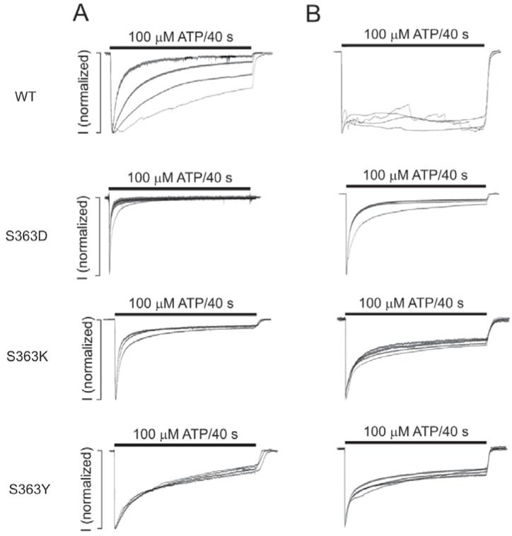 Figure 9. The patterns of extracellular ATP-induced current responses in cells expressing the wild type (WT) and the S363D, S363K, and S363Y mutant receptors of P2X2aR, in the absence (A) or in the presence of 5 mM intracellular ATP (B). The experiments were performed in HEK393 cells expressing P2X2R at a holding potential of −60 mV. Notice the loss of UDD in all S363-P2X2aR mutants in the absence and presence of intracellular ATP.
