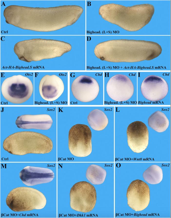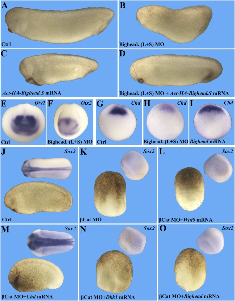 Fig 4 Bighead is required for head development in a BMP-independent way. All embryo pictures were taken at 25à magnification. (AâD) Bighead knockdown inhibits head formation, which is rescued by coinjection of MO-resistant Bighead mRNA. Embryos were injected two times dorsal-marginal at the four-cell stage as indicated and collected at the tailbud stage. The dosages for MO and mRNA were as follows: 32 ng of Bighead (L+S) MOs (directed against the L and S Bighead genes) and 800 pg of Act-HA-Bighead.S mRNA. Numbers of embryos analyzed were as follows: Controls (Ctrl), n = 153, 100% normal; Bighead MOs, n = 122, 93% with a small head phenotype; MO-resistant HA-Bighead mRNA, n = 109, 95% with a dorsalized phenotype; rescue by coinjection of MO and Bighead mRNA, n = 94, 87% rescued. (E and F) In situ hybridization for Otx2 confirming that Bighead knockdown inhibits forebrain development. Embryos were injected two times dorsal-marginal at the four-cell stage with 32 ng of Bighead MO and collected at stage 15. Ctrl, n = 35, 100% normal; Bighead mRNA, n = 48, 83% with enlarged brain phenotype. (G) Expression of the organizer marker chordin at gastrula stage 10.5. (H) Chordin expression was decreased by Bighead MOs. (I) Chordin expression was increased by injection of 800 pg of Bighead mRNA into the animal pole. Note the reduction of Chordin by Bighead MO (n = 34, 100% with phenotype) and expansion of Chordin by Bighead mRNA (n = 47, 93% with increased chordin). (JâO) Experiments with β-cateninâdepleted embryos demonstrating that Bighead is not a BMP antagonist but, instead, behaves as a Wnt antagonist. (K) Embryos were injected with 24 ng of β-catenin MO four times into the marginal-vegetal region at the two-cell stage. Then, at the four-cell stage, one dorsal-marginal cell was injected with 1 pg of xWnt8 mRNA (L), 100 pg of Chordin mRNA (M), 50 pg of Dkk1 mRNA (N), or 400 pg of Bighead mRNA (O). Embryos were collected for in situ hybridization with the neural marker Sox2 at stage 18. Note that β-catenin MO completely ventralized embryos and that only the BMP antagonist Chordin could rescue an axis. xWnt8 mRNA was entirely inactive in β-cateninâdepleted embryos, as were Dkk1 and Bighead. Numbers of embryos analyzed were as follows: J, n = 47, 100%; K, n = 52, 100% with a ventralized phenotype; L, n = 29, 100% ventralized; M, n = 34, 92% with rescued CNS; N, n = 29, 97% ventralized; O, n = 32, 97% completely ventralized. |