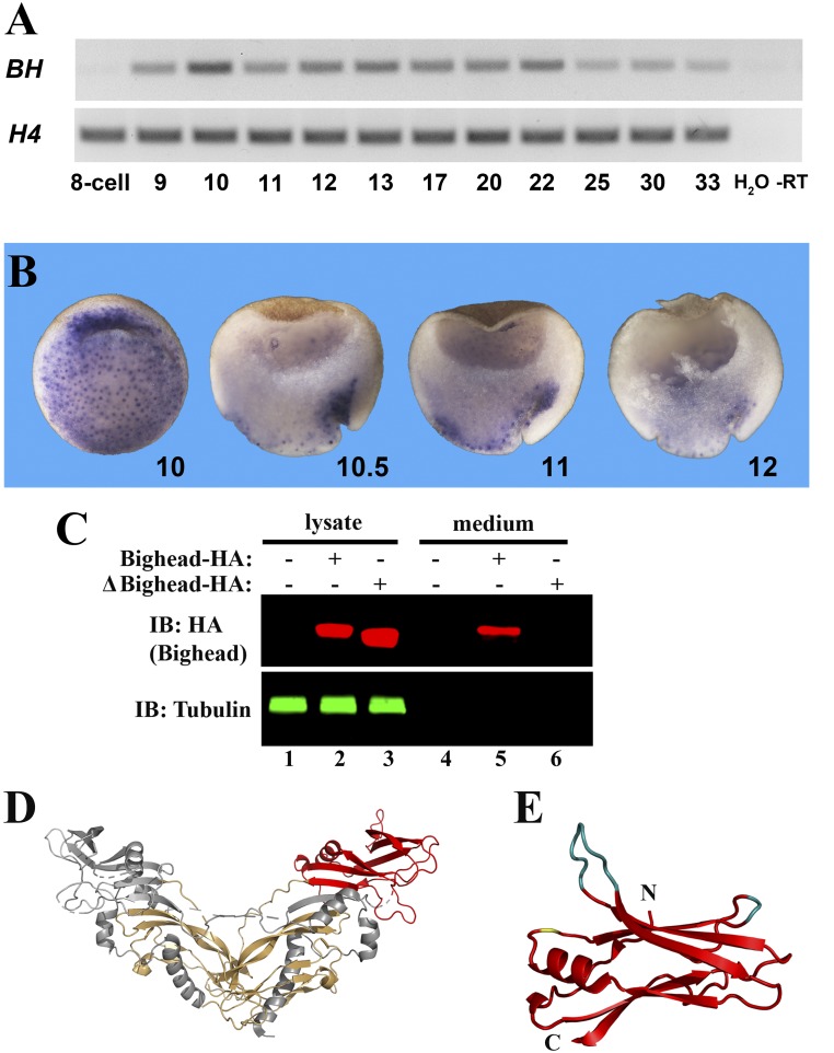 Fig 2 Bighead is a Spemann organizer-secreted protein. (A) RT-PCR assay showing Bighead (BH) expression across different developmental stages. Histone 4 (H4) was used as a loading control. H2O and âRT served as negative controls. (B) In-situ hybridization of Bighead shows its prominent localization in the Spemann organizer in stage 10 whole embryos and stage 10.5â12 hemisected embryos. Note that there is prominent pan-endodermal localization, particularly in nuclei of the superficial yolk plug region. Embryo pictures were taken at 25à magnification. (C) Wild-type Bighead was secreted into the culture medium by transfected HEK293T cells (lane 5), while a mutant Bighead (ÎBighead) lacking the signal peptide was not (lane 6). Tubulin served as a loading control. IB, immunoblot. (D) Crystal structure of myostatin/GDF8 dimer (38), showing in red the C-terminal part of one of its prodomains that may share structural similarities with Bighead. The amino-terminal part of the myostatin prodomain is shown in gray, and the mature growth factor dimer is shown in yellow. (E) Close-up view of the conserved pro-myostatin structural domain, showing that the deletions (cyan) and insertions (yellow) found in Bighead homologs (Dataset S4) fall within loops without perturbing the β-sheet and α-helical structures. |