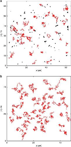 Figure 1. Observed dynamic heterogeneity in the AChR trajectories.(a) Overall 130 representative AChR trajectories with 300 time steps (60âs). These trajectories are taken from the bottom membrane of a Xenopus muscle cell. Red trajectories indicate fast moving AChRs and black ones indicate ânearly immobile' AChRs. (b) A total of 52 representative trajectories of silica spheres 2.14âμm in diameter undergoing Brownian diffusion in water over a flat substrate with 1,000 time steps (47âs).