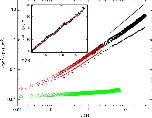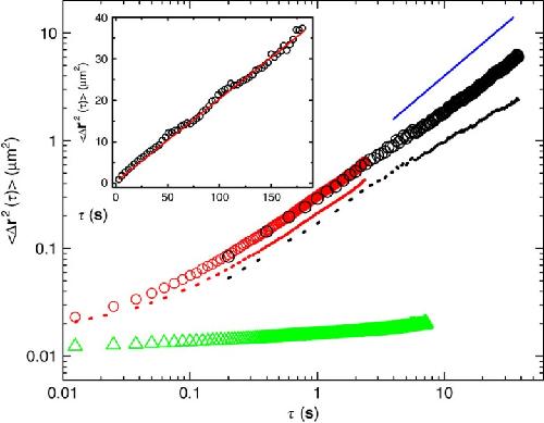 Figure 3. Crossover from sub-diffusion to normal diffusion observed from the MSD curve.Measured 〈Δr2(τ)〉 as a function of delay time τ for the AChR trajectories taken at two sampling rates of 80 fps (red dashed line and circles) and 5 fps (black dashed line and circles). Data from a single cell are used in the ensemble average. The red and black dashed lines are obtained when both the mobile and immobile trajectories are included in the calculation. The red and black circles are obtained when only the mobile trajectories are included in the ensemble average. The green triangles are obtained when only the immobile trajectories are included in the ensemble average. The blue solid line indicates the relationship 〈Δr2(τ)〉∼τ with a slope of unity in the log–log plot. Inset shows a linear plot of the measured 〈Δr2(τ)〉 as a function of τ and the red solid line is a linear fit to the data points.