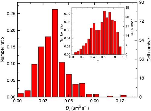 Figure 4. Cell-to-cell variations in the measured long-time diffusion coefficient DL and mobile ratio γ of the AChRs.Distribution of the measured DL of AChRs. Inset shows the distribution of the measured γ of the AChRs. The total number of cells used in the statistics is 365.