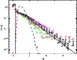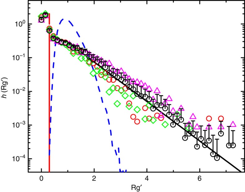 Figure 2. Normalized histogram of the radius of gyration of AChR trajectories.Measured PDF of the normalized for the AChR trajectories taken under different sample conditions: cultured for 1âday after dissection (red circles), cultured for 4âdays (magenta triangles), and cultured for 8âdays (green diamonds). Each is obtained by averaging the data from 10 cells cultured under the same condition. The black circles are obtained by averaging the data from 70 cells. Their statistics is considerably improved with small error bars indicating the standard deviations. The solid black line shows the exponential function, . The dashed blue line shows the measured for silica spheres undergoing Brownian diffusion. The vertical red line indicates the cutoff value used to define the immobile trajectories.
