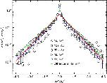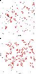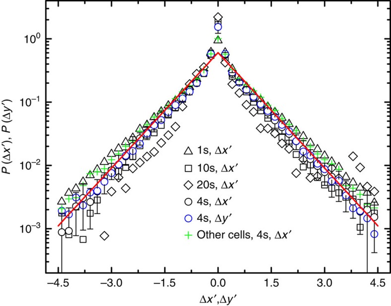 Figure 5. Non-Gaussian behaviour of the normalized histogram of AChR's displacements.Measured PDFs P(Δx′) and P(Δy′) of the normalized displacements Δx′ and Δy′ for the trajectories of mobile AChRs. Data are obtained from 10 cells under each sample condition: (i) Δx′(τ) with τ=1 s (black triangles), 4 s (black circles), 10 s (black squares) and 20 s (black diamonds); (ii) Δy′(τ) with τ=4 s (blue circles) and (iii) Δx′(τ) with τ=4 s for a group of 10 cells from a different frog (green crosses). The red solid line is an exponential fit to the data points, P(Δx′)≃a exp (−β|(Δx′)|), with a=0.6 and β=1.4.
