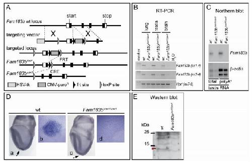 size Northern blots are shown in Supplementary Figure S4. (D) WISH of E7.75 wt (a,b) and Fam183bΔex1/Δex1