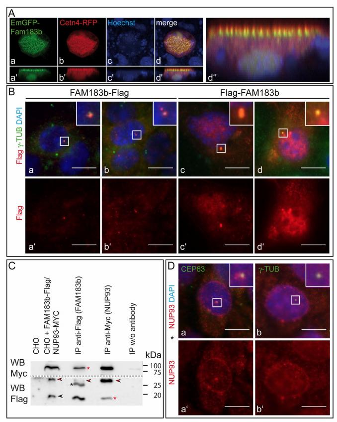 Figure 2. Subcellular localisation of FAM183B. (A) Co-localisation of mouse FAM183b-GFP with centrin4