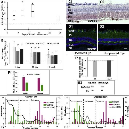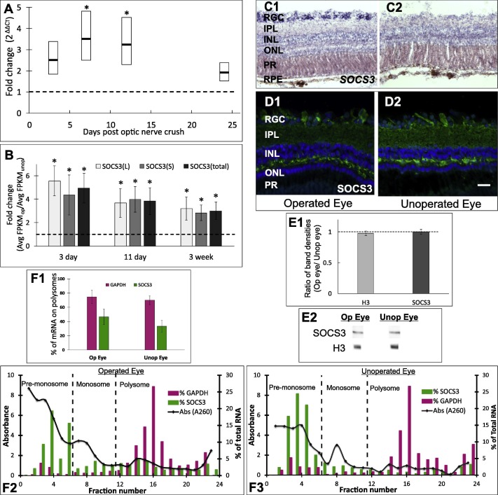 SOCS3 mRNA increased but protein levels remained unchanged at the peak of optic axon regenerative outgrowth. A) Quantitation by RT-qPCR for SOCS3 mRNA (S+L homeologs combined), normalized to GAPDH during successive phases of optic axon regeneration (early, 3 days; middle 7 & 12 days; and late, 24 days). Horizontal bars, mean fold change (2exp(ΔΔC T ); 3 biological replicates, 6 animals per replicate); boxes, ±SEM; *, statistically significant at p < 0.05. B) Quantitation by RNA-seq of fold changes in SOC3 mRNA levels (Operated Eye/Unoperated Eye; mean ± SEM) from whole eye lysates for Xenopus laevis SOCS3 homeologs, separately (S&L) and combined (total), as indicated, during the early trauma phase (3 day), the peak period of regenerative axon outgrowth (11 day) and the phase of synaptic refinement (3 week) after orbital optic nerve crush ( n=3 replicates of 6 pooled animals, * p < 0.001). C) Representative example of in situ hybridization using DIG-labelled SOCS3 cRNA on retinal sections of operated eye after orbital optic nerve crush (C1) and the contralateral, unoperated eye (C2), during the peak of regenerative axon outgrowth (12 days) . SOCS3 mRNA expression increased in the retinal ganglion cell layer (RGC) of the operated eye. D) Immunostaining of retinal sections from the operated (D1) and unoperated eye (D2) for SOCS3 protein (green, xSOCS3.1 antibody; blue, DAPI-stained nuclei), at the same time point as in C1,2. Scale bar, 20 μm, applies to C1−D2. Abbreviations in C, D: RGC, retinal ganglion cell layer; IPL, inner plexiform layer; INL, inner nuclear layer; ONL, outer nuclear layer; PR, photoreceptor layer. Quantitation of the mean fluorescence intensity for SOCS3 in RGC, (n = 7 animals), at 7−12 days post crush, confirmed there was no statistically significant difference in SOCS3 protein expression between the operated and unoperated eye (paired sample t-test; p = 0.18). E) Western blots of total protein from operated (Op) and unoperated (Unop) eye during the peak of regenerative axon outgrowth (12 days), immunostained for SOCS3 (xSOCS3.1) and histone 3 (H3, loading control). E1, Average band intensities (±SEM; n = 3 replicates of 3−6 pooled animals/replicate) for SOCS3 and H3, indicating showing no significant change in expression (dotted line, ratio of 1.0 between operated and unoperated eye; p = 0.25, p = 0.95, for SOCS3 and H3, respectively). E2, bands from representative gels. F) Polysome profiling of SOCS3 and GAPDH mRNAs during the peak period of regenerative axon outgrowth, demonstrating the presence of mRNA in the polysomal (efficiently translated) fractions of both operated (Op) and unoperated (Unop) eye. F1, Average percentage (±SEM) of SOCS3 and GAPDH mRNAs present in polysome fractions, indicating no statistical difference between Op and Unop eyes (p = 0.13; n=3 biological replicates, 6 pooled animals/replicate). F2,3, representative examples of polysome profiles from the operated and unoperated eye, respectively. Bars & right axis, relative fraction (%) of each mRNA in the indicated fraction; black line & left axis, A 260 ; vertical dotted lines, premonosomal, monosomal, and polysomal fractions, as indicated.