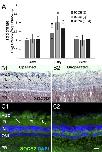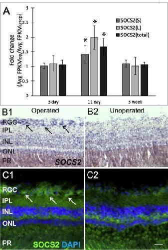 SOCS2 mRNA and protein levels increased at the peak of optic nerve regeneration. (A) Quantitation by RNA-seq of SOCS2 mRNA levels for the X. laevis homeologs, as in Fig. 1 A. Expression in the operated eye was significantly greater (*, p < 0.05) relative to that in the unoperated eye, at only 11 days. B1−C2) In situ hybridization and immunofluorescence for SOCS2 mRNA and protein at 12 days, as illustrated in Fig. 1 C1−D2 for SOCS3. Arrows in B1 and C1 indicate increased expression of SOCS2 mRNA and protein, respectively, in RGC. Quantitation of the difference in mean fluorescence intensity between paired samples of operated and contralateral unoperated eyes confirmed this increase was statistically significant (paired t-test, p < 0.05; n = 5 animals; Tukey’s post hoc power analysis = 87%).