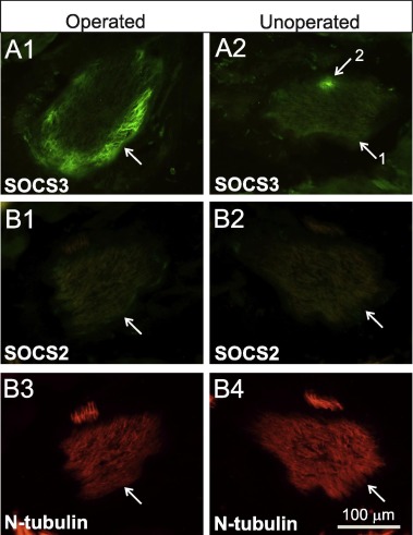 SOCS3, but not SOCS2, protein levels were elevated in regenerating axons. (A1,2) Operated and contralateral, unoperated optic nerve, respectively, immunostained and imaged under epifluorescence (25X, 0.6 NA) with the second, independently generated, affinity-purified Xenopus SOCS3 antibody (1:200). A1, arrow: SOCS3 positive axons in the peripheral margins of the operated optic nerve, where the newest regenerating axons lie. A2, arrow #1: contralateral, unoperated optic nerve, within the same section as that of A1. The unoperated nerve generally exhibited low to background levels of SOCS3 staining except for isolated clusters of SOCS3 positive axons in the periphery (A2, arrow #2), which likely represented aberrantly projecting, regenerating axons from the operated side ( Zhao and Szaro, 1994 ). (B1-4) Paired operated (B1,3) and contralateral unoperated (B2,4) optic nerves, double immunostained for SOCS2 (green; B1,2), which was present at low to background levels, and a neuronal β-tubulin (N-tubulin, red; B2,4), which labeled axons. Arrows in B1−4 point to the optic nerve. Scale bar in B4 applies to all panels.