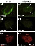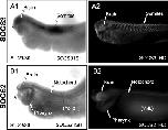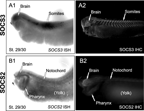 Co-localization of mRNA (A1, B1) and protein (A2, B2) for SOCS3 (A1,2) and SOCS2 (B1,2) in stage 29/30 embryos. In situ hybridization (ISH) with digoxigenin labeled cRNA probes detected the mRNA in the same structures as seen with immunohistochemistry (IHC). Arrows indicate expression in brain and somites for SOCS3 (A1,2), and in brain, notochord, and primitive pharynx for SOCS2 (B1,2).