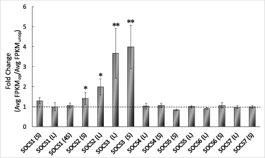Quantitation of mRNA fold-changes of all SOCS gene family members. Quantitation by RNA-seq of fold-changes (operated eye/unoperated eye; mean ± SEM) in X. laevis orthologs of mammalian SOCS gene family members at the peak of regenerative axon outgrowth (11 days). ** p < 0.001; *p < 0.05; n = 3 replicates of 6 pooled animals each.