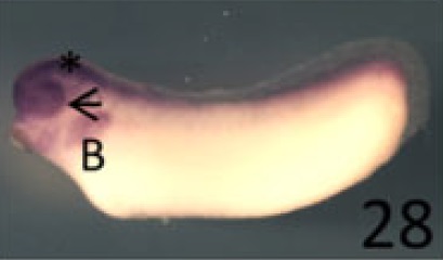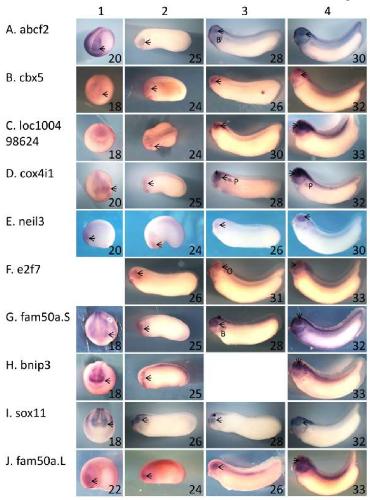 Figure 1 â Ten of the genes identified as exhibiting rax-dependent expression are expressed in the developing eye. A â J: Xenopus laevis embryos were fixed and subjected to in situ hybridization using antisense riboprobes specific for 10 of the genes identified as exhibiting rax-dependent expression in the microarray screen described in the text. Genes/riboprobes are identified to the left of each row. Embryos used were late neurula (st 18 â 20, column 1), with the exception of J1 (st 22), early tailbud (st 24 and 25, column 2), mid tailbud (st 25 â 31, column 3), and mid-late tailbud (st 30 â 33, column 4). Lateral views are shown for all embryos except for A1, B1, C1, D1, G1, H1, I1, where anterior views are shown. In all cases, dorsal is towards the top of the figure. Abbreviations and marks: arrowhead â eye; * - brain; B â branchial arches; P â pronephros.