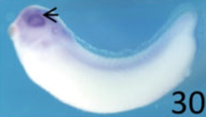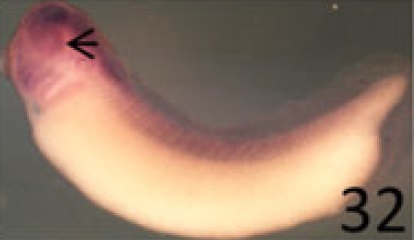 neil3 (nei-like DNA glycosylase 3) gene expression in Xenopus laevis embryo, assayed via in situ hybridization, NF stage 30, lateral view, anterior left, dorsal up.